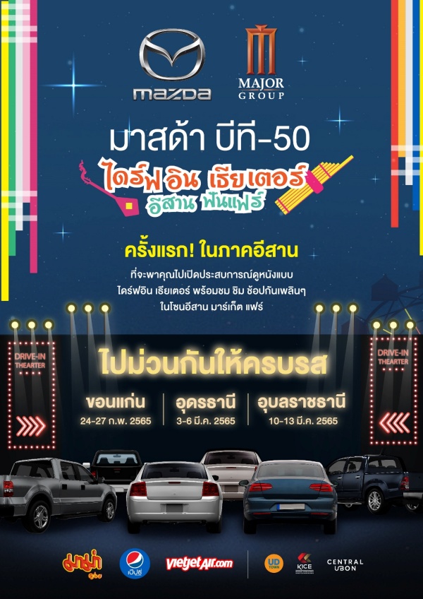 มาสด้า เซลส์ ประเทศไทย จับมือ เมเจอร์ ซีนีเพล็กซ์ กรุ้ป เตรียมจัดงานอย่างยิ่งใหญ่ในระดับภูมิภาค เพื่อกระตุ้นเศรษฐกิจระดับท้องถิ่น พร้อมจัดกิจกรรมเพื่อสื่อสารภาพลักษณ์รถปิกอัพสุดหรู มาสด้า บีที-50 เดินเกมบุก 3 จังหวัดใหญ่ ศูนย์กลางเศรษฐกิจของภาคอีสาน กับกิจกรรมการตลาดรูปแบบใหม่ (On-ground Marketing) อย่างเต็มรูปแบบ พร้อมชูไฮไลท์เด็ด ไดร์ฟอิน เธียเตอร์ ครั้งแรกของการดูหนังสไตล์ใหม่ พร้อมชม ชิม ช้อป และสนุกสนานเพลิดเพลินตลอดงานกับ “มาสด้า บีที-50 ไดร์ฟอิน เธียเตอร์ อีสาน ฟันแฟร์” ประเดิมจัดครั้งแรกที่จังหวัดขอนแก่น ตามมาด้วยจังหวัดอุดรธานี และสุดท้ายที่จังหวัดอุบลราชธานี พร้อมเชิญชวนแฟนหนังร่วมสนุกลุ้นรับบัตรเข้าชมฟรี