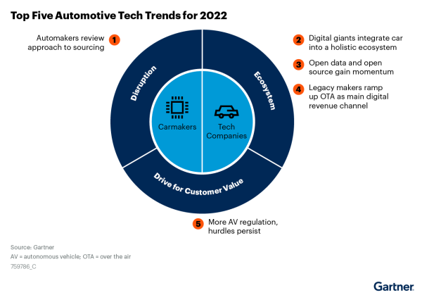 การ์ทเนอร์ เปิด 5 แนวโน้มเทคโนโลยีสำคัญในปี 2565 ที่ผู้บริหารด้านไอทีควรพิจารณาเพื่อเตรียมพร้อมรับมือกับการเปลี่ยนผ่านของซอฟต์แวร์ ฮาร์ดแวร์ และด้านดิจิทัลที่เกิดขึ้นในอุตสาหกรรมยานยนต์