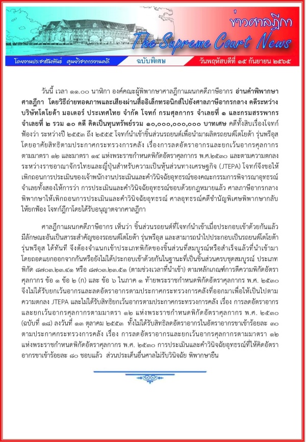 คดีระหว่าง บริษัทโตโยต้า มอเตอร์ ประเทศไทย จำกัด โจทก์ กรมศุลกากร จำเลยที่ ๑ และกรมสรรพากร จำเลยที่ ๒ รวม ๑๐ คดี คิดเป็นทุนทรัพย์รวม ๑๐,๐๐๐,๐๐๐,๐๐๐ บาทเศษ คดีท้ังสิบเรื่อง โจทก์ฟ้องว่า ระหว่างปี ๒๕๕๓ ถึง ๒๕๕๕ โจทก์นำเข้าชิ้นส่วนรถยนต์เพื่อนามาผลิตรถยนต์โตโยต้า รุ่นพรีอุส โดยอาศัยสิทธิตามประกาศกระทรวงการคลัง เรื่องการลดอัตราอากรและยกเว้นอากรศุลกากร ตามมาตรา ๑๒ และมาตรา ๑๔ แห่งพระราชกาหนดพิกัดอัตราศุลกากร พ.ศ.๒๕๓๐ และตามความตกลง ระหว่างราชอาณาจักรไทยและญี่ปุ่น สาหรับความเป็นหุ้นส่วนทางเศรษฐกิจ (JTEPA) โจทก์จึงขอให้เพิกถอนการประเมินของเจ้าพนักงานประเมินและคำวินิจฉัยอุทธรณ์ของคณะกรรมการพิจารณาอุทธรณ์