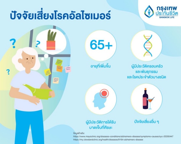 ศูนย์บริการการแพทย์ บริษัท กรุงเทพประกันชีวิต จำกัด (มหาชน) ให้ข้อมูลว่า โรคอัลไซเมอร์ เป็นภาวะเสื่อมสภาพสมองที่เกิดความผิดปกติในความจำ ความคิด และพฤติกรรม ซึ่งเกิดจากการสะสมของโปรตีนที่ผิดปกติในสมอง ส่งผลให้การเชื่อมต่อระหว่างเซลล์ประสาทมีปัญหา และทำให้เกิดการตายของเซลล์ประสาทในที่สุด แม้สาเหตุที่แท้จริงของโรคอัลไซเมอร์ยังไม่เป็นที่เข้าใจอย่างชัดเจน แต่อายุ พันธุกรรม และปัจจัยด้านการดำเนินชีวิตอาจเป็นปัจจัยเสี่ยงของโรคซึ่งอาการมักพัฒนาอย่างช้าๆ จนยกระดับไปถึงขั้นรุนแรง โดยอาการเด่นที่สุดคือการสูญเสียความจำ