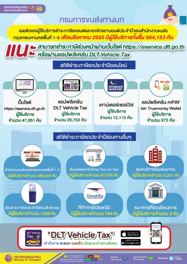ในเดือนสิงหาคม 2565 สามารถจัดเก็บภาษีรถประจำปีของสำนักงานขนส่งกรุงเทพมหานครพื้นที่ 1-5 ได้ทั้งสิ้น 822,214,293.07 บาท มีผู้ใช้บริการชำระภาษีรถประจำปีออนไลน์ รวมจำนวน 81,800 คัน แบ่งเป็น แอปพลิเคชัน DLT Vehicle Tax จำนวน 20,762 คัน ผ่านเว็บไซต์ https://eservice.dlt.go.th จำนวน 47,951 คัน เคาน์เตอร์เซอร์วิส จำนวน 12,115 คัน ผ่านแอปพลิเคชัน mPAY และ Truemoney Wallet จำนวน 972 คัน ในส่วนการใช้บริการรับชำระภาษีรถประจำปี ณ สำนักงานขนส่งกรุงเทพมหานครพื้นที่ 1-5 มีผู้ใช้บริการจำนวน 389,320 คัน การใช้บริการเลื่อนล้อต่อภาษี (Drive Thru for Tax) จำนวน 87,076 คัน ศูนย์บริการร่วมคมนาคม 3,221 คัน ที่ทำการไปรษณีย์ จำนวน 794 คัน ตู้รับชำระภาษีรถประจำปีอัตโนมัติ (Kiosk) จำนวน 1,939 คัน ผ่านธนาคารที่ร่วมโครงการ จำนวน 3 คัน รวมมียอดผู้ใช้บริการชำระภาษีประจำเดือนสิงหาคม 2565 ทั้งสิ้น 564,153 คัน