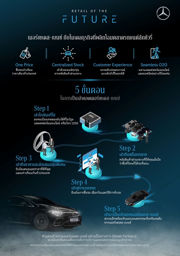 เมอร์เซเดส-เบนซ์ ประเทศไทย มีความมุ่งมั่นในการส่งมอบรถยนต์ที่มีความหรูหราและเป็นที่ต้องการ ควบคู่ไปกับการนำเสนอประสบการณ์ที่เหนือระดับในทุกมิติให้กับลูกค้าทุกคน โมเดลธุรกิจ “Retail of the Future” ถือเป็นเครื่องพิสูจน์ให้เห็นถึงจิตวิญญาณแห่งนวัตกรรมของเมอร์เซเดส-เบนซ์ ที่สะท้อนผ่านทุกก้าวสำคัญในการออกแบบการเดินทางที่น่าตื่นเต้นและน่าประทับใจให้กับผู้ที่เป็นเจ้าของ เมอร์เซเดส-เบนซ์ ทุกคน