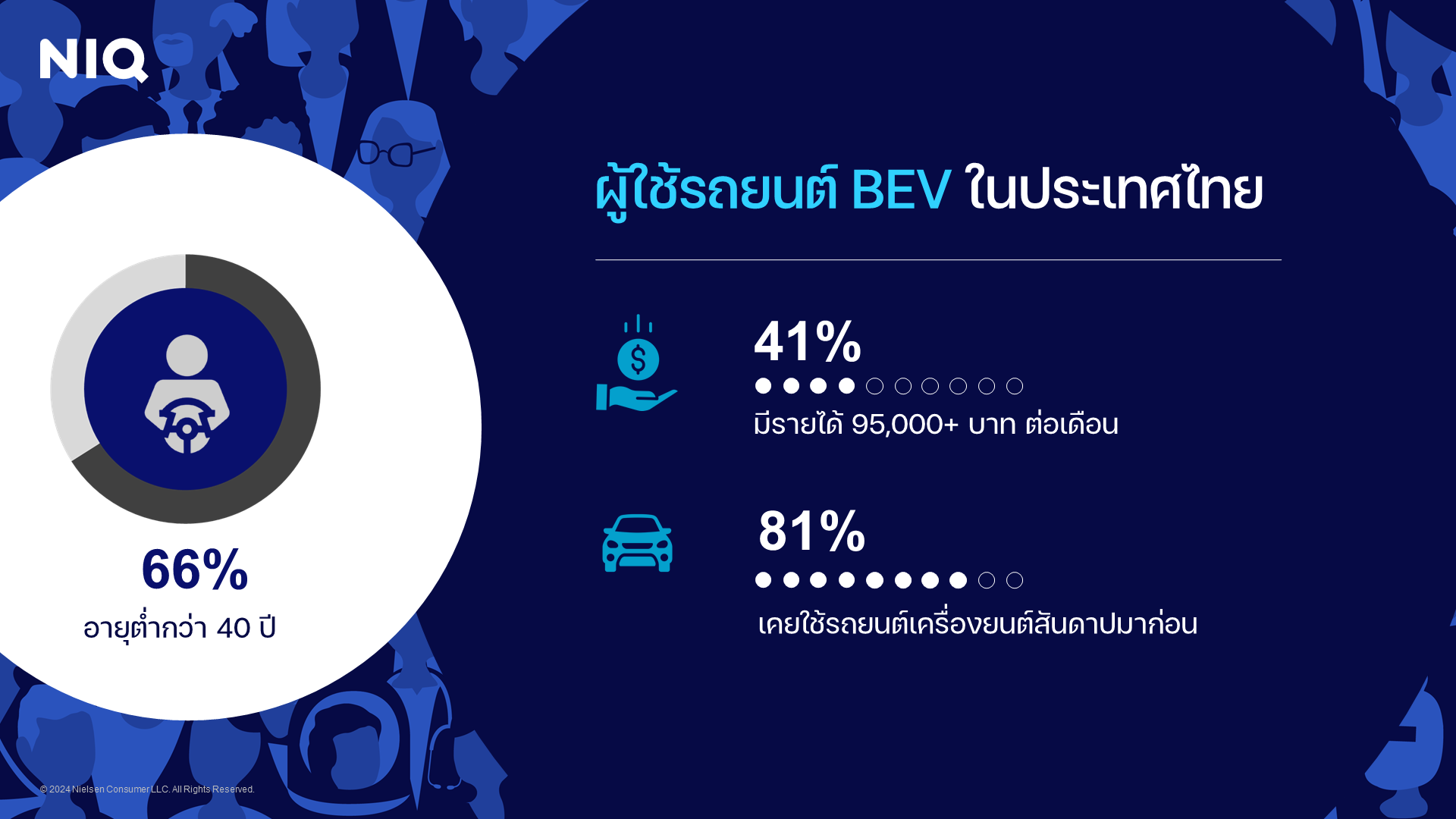 ผู้ขับขี่รถยนต์ไฟฟ้าในประเทศไทยส่วนใหญ่เป็นกลุ่มคนรุ่นใหม่ (อายุต่ำกว่า 40ปี) ซึ่งมีสัดส่วนถึง 66% และมีรายได้สูงถึง 95,000 บาทต่อเดือนขึ้นไปกว่า 41%