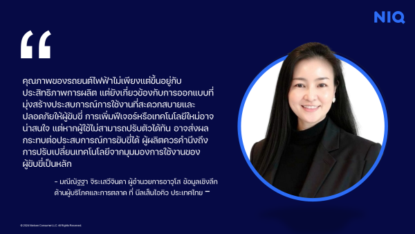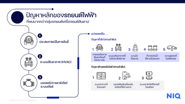 นีลเส็นไอคิวเผยผลสำรวจคุณภาพ รถยนต์ไฟฟ้าผ่านมุมมองผู้ใช้งานชาวไทย:ความท้าทายและโอกาสในการพัฒนาผู้ขับขี่รถยนต์ไฟฟ้าแบตเตอร์รี่ประสบปัญหาด้านคุณภาพเฉลี่ยถึง 174ปัญหาต่อรถ 100 คัน ในขณะที่รถยนต์ทั่วไปพบปัญหาน้อยกว่าที่ 161ปัญหาต่อรถ 100 คัน ซึ่งสะท้อนให้เห็นว่า ผู้ผลิตรถยนต์ไฟฟ้ายังคงเผชิญกับความท้าทายด้านคุณภาพรถยนต์