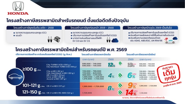 โครงสร้างภาษีสรรพสามิตใหม่สำหรับรถยนต์ปี 2569 และราคาขายรถยนต์ฮอนด้าถึงวันที่ 6 เม.ย. 2569
