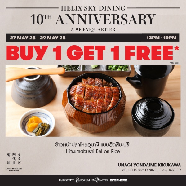 ฉลอง 10 ปี Helix Sky Dining ชั้น 5-9 ศูนย์การค้าเอ็มควอเทียร์ ในระหว่างวันที่ 27 -29 พฤษภาคม 2568 เพียง 3 วันเท่านั้น สอบถามรายละเอียดเพิ่มเติมได้ที่ Facebook : Emporium Emquartier และ Emsphere at EM District หรือ LINE @EMDISTRICT