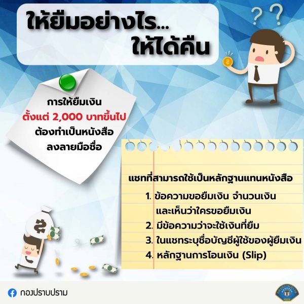 โดยทางกฎหมายแล้ว การให้ยืมเงินตั้งแต่ 2,000 บาทขึ้นไปต้องทำหลักฐานเป็นหนังสือ แล้วลงลายมือชื่อ ถ้าไม่ทำเอกสารหลักฐาน ก็จะฟ้องบังคับต่อศาลไม่ได้ หรือหากกู้ยืมเงินน้อยกว่า 2,000 บาท ไม่จำเป็นต้องมีหลักฐานเป็นเอกสารก็ฟ้องร้องต่อศาลได้ (ป.พ.พ. มาตรา 653)