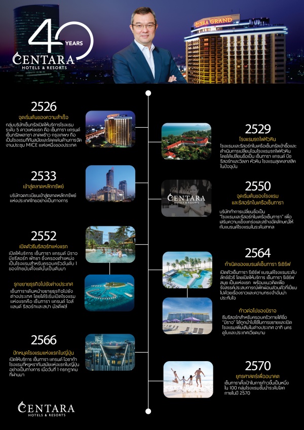 โรงแรมและรีสอร์ทในเครือเซ็นทารา เครือโรงแรมชั้นนำของประเทศไทย จัดงานฉลองครบรอบ 40 ปีอย่างยิ่งใหญ่ ตอกย้ำความแข็งแกร่งของแบรนด์ ชูความสำเร็จตลอด 4 ทศวรรษที่ผ่านมา จากเซ็นทารา แกรนด์ แอท เซ็นทรัลพลาซา ลาดพร้าว กรุงเทพฯ โรงแรมแห่งแรกในปี พ.ศ. 2526 เติบโตสู่แบรนด์โรงแรมสัญชาติไทยในระดับโลก ที่ปัจจุบันมีโรงแรมทั้งสิ้น 93 แห่งทั่วภูมิภาคเอเชียและตะวันออกกลาง