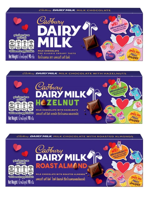 ต่อด้วยการสื่อความรู้สึกจากหัวใจด้วย “แคดเบอรี แดรี่ มิลค์” ช็อกโกแลตสุดพรีเมียมสัญชาติอังกฤษ ที่มอบความอร่อยเข้มข้นด้วยนมสดหนึ่งแก้วครึ่งในทุกแท่ง คัดสรรวัตถุดิบคุณภาพและใส่ใจการผลิตด้วยจากโครงการโกโก้ ไลฟ์ (Cocoa Life) ซึ่งเป็นโครงการส่งเสริมการผลิตโกโก้ที่มีคุณภาพบนพื้นฐานของความยั่งยืน ช่วยเต็มเติมทุกความสุข สนุกทุกการแบ่งปัน ซึ่งคอลเลคชั่นพิเศษสำหรับเทศกาลแห่งความรักนี้ มาในขนาด 90 กรัม ราคา 75 บาท พร้อมมอบความอร่อยถึง 3 รสชาติ ทั้ง ช็อกโกแลตนม (Dairy Milk Chocolate) ช็อกโกแลตนมผสมอัลมอนด์ (Dairy Milk Roast Almond) และช็อกโกแลตนมผสมเฮเซลนัท (Dairy Milk Hazelnut) โดยมาพร้อมแพ็กเกจจิ้งสุดน่ารัก กับลวดลายกราฟฟิค ทั้งรูปหัวใจ คัพเค้ก จดหมายรัก และม้าโพนี่ รับช่วงวาเลนไทน์หวานนี้