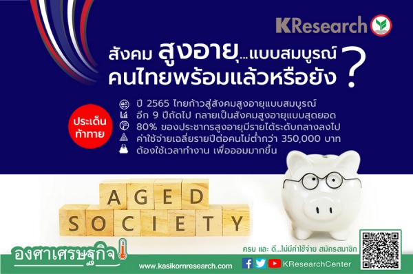 ไทยกำลังจะเป็นประเทศกำลังพัฒนาประเทศแรกของโลกที่ก้าวเข้าสู่สังคมสูงอายุแบบสมบูรณ์ (Aged Society) ในปี 2565 อีก 9 ปีถัดไปจะกลายเป็นสังคมสูงอายุแบบสุดยอด (Hyper-Aged Society) ซึ่งเป็นอัตราที่เร็วกว่าญี่ปุ่น