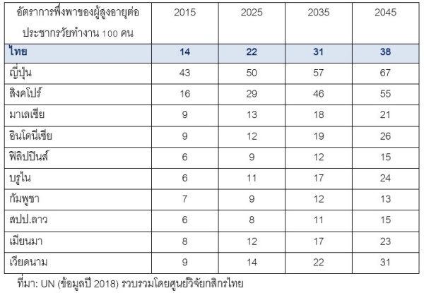 จากการประเมินมิติด้านจำนวน รายได้และค่าใช้จ่ายข้างต้น ไม่เพียงสะท้อนว่า ในที่สุดแล้วอัตราการพึ่งพิงของผู้สูงอายุ (อายุ 65 ปีขึ้นไป) ต่อประชากรวัยทำงาน (อายุ 15-64 ปี) 100 คนของไทย จะมีแนวโน้มเพิ่มขึ้น โดยขยับเข้าหาระดับ 30 สำหรับการเป็นสังคมสูงอายุแบบสุดยอด เทียบกับที่อยู่ที่ระดับใกล้ 20 ในช่วงของการเป็นสังคมสูงอายุแบบสมบูรณ์ และหากเทียบกับประเทศส่วนใหญ่ในอาเซียนที่ยังมีระดับที่ต่ำกว่าไทยอยู่มาก ก็นับว่าเป็นแรงกดดันพอสมควรสำหรับเศรษฐกิจและตลาดแรงงานไทย เพราะหมายความว่า ครอบครัวลูกหลานหรือผู้ที่ดูแลผู้สูงอายุอาจเผชิญความท้าทายด้านกำลังซื้อที่มีข้อจำกัดมากขึ้นเรื่อยๆ ส่วนกรณีผู้สูงอายุบางส่วนที่อาจจะไม่มีครอบครัวลูกหลานหรือผู้ดูแล ก็คงจำเป็นต้องพึ่งพาสวัสดิการหรืองบประมาณของภาครัฐในการบริหารจัดการเพื่อให้ผู้สูงอายุกลุ่มนี้สามารถดำรงชีพได้ จึงอาจกระทบต่อการจัดสรรงบประมาณเพื่อการอื่นๆ