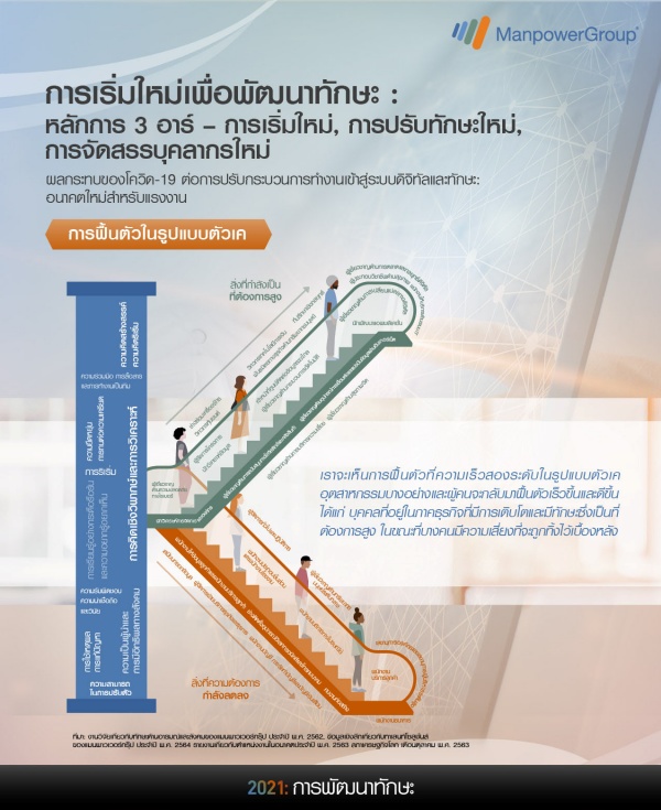 จากภาพข้างต้นที่เรียกว่า THE EMERGENCE OF THE K RECOVERY หรือ การฟื้นตัวในรูปแบบตัวเค ทั้งนี้จากผลการวิจัยมีการคาดการณ์ว่าในอีก 1 ปีต่อจากนี้จะเห็นภาพและความเร็วในการฟื้นตัวในสองระดับ โดยอุตสาหกรรมบางอย่างและผู้คนจะกลับมาฟื้นตัวเร็วขึ้นและดีขึ้น ได้แก่ บุคคลที่อยู่ในภาคธุรกิจที่มีการเติบโตและมีทักษะซึ่งเป็นที่ต้องการสูง อาทิ นักวิเคราะห์การจัดการและองค์กร ผู้เชี่ยวชาญด้านการสนับสนุนทางโลจิสติกส์และคลังสินค้า, ผู้จัดการโครงการ, ช่างซ่อมเครื่องจักรวิศวกรหุ่นยนต์, วิศวกรเทคโนโลยีการเงิน, พันธมิตรทางธุรกิจด้านทรัพยากรมนุษย์, นักพัฒนาแอปพลิเคชั่น นักวิเคราะห์ข้อมูลหรือผู้เชี่ยวชาญด้านกระบวนการอัตโนมัติ เป็นต้น