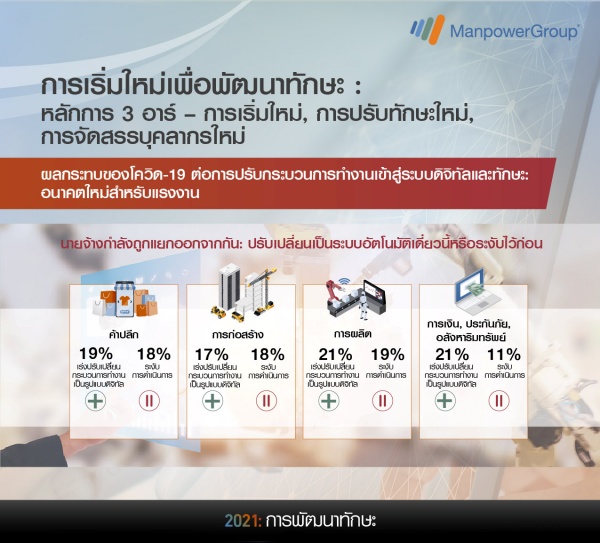 มร.โจนาส ไพรซิง ประธานกรรมการและประธานเจ้าหน้าที่บริหาร แมนพาวเวอร์กรุ๊ป เปิดเผยว่า การเปลี่ยนแปลงด้านแรงงานครั้งใหญ่ซึ่งเกิดขึ้นอย่างรวดเร็วในปีที่ผ่านมาจากการแพร่ระบาดของไวรัสโควิด-19 ซึ่งเป็นวิกฤตด้านสุขภาพและพัฒนาไปสู่ภาวะวิกฤตทางเศรษฐกิจกับสังคม โดยในช่วงแรกภาคอุตสาหกรรมทั้งหมด ไม่ว่าจะเป็นการบริการ, การเดินทางและแม้แต่การผลิตเกิดภาวะหยุดชะงักในชั่วข้ามคืน ขณะที่อุตสาหกรรมอื่นๆ ได้แก่ เทคโนโลยี, การดูแลสุขภาพ, โลจิสติกส์และการค้าปลีก มีความต้องการด้านแรงงานเพิ่มขึ้นอย่างรวดเร็วและต่อเนื่อง ในเวลาเดียวกัน องค์กรต่างๆ มีการปรับเปลี่ยนกระบวนการทำงานเป็นรูปแบบดิจิทัลมากขึ้น ในขณะที่ประชากรร้อยละ 93 มีวิธีการทำงาน รูปแบบการใช้ชีวิตและการบริโภคที่เปลี่ยนแปลงไปอย่างมาก ทั้งนี้จากการคาดการณ์สิ่งที่จะเกิดขึ้นดังกล่าวข้างต้นกลับเกิดขึ้นเร็วกว่าที่คาดการณ์อย่างมีนัยสำคัญ