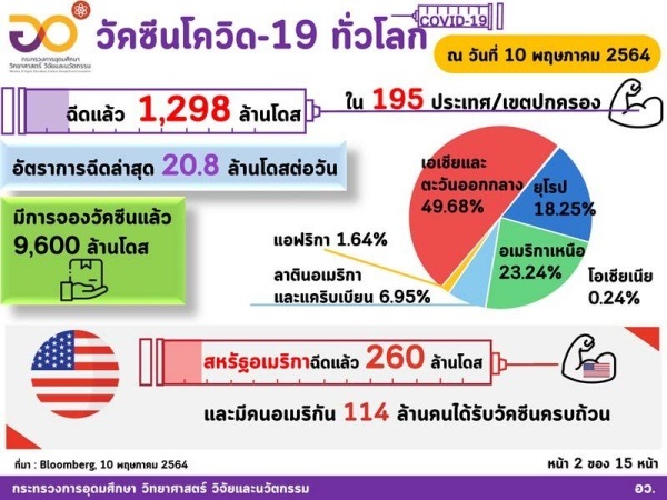 ทั้งนี้ ทั่วโลกได้ฉีดวัคซีนแล้ว 1,298 ล้านโดส ใน 195 ประเทศ ส่วนภูมิภาคอาเซียนได้ฉีดวัคซีนไปแล้ว 35,643,447 โดส
