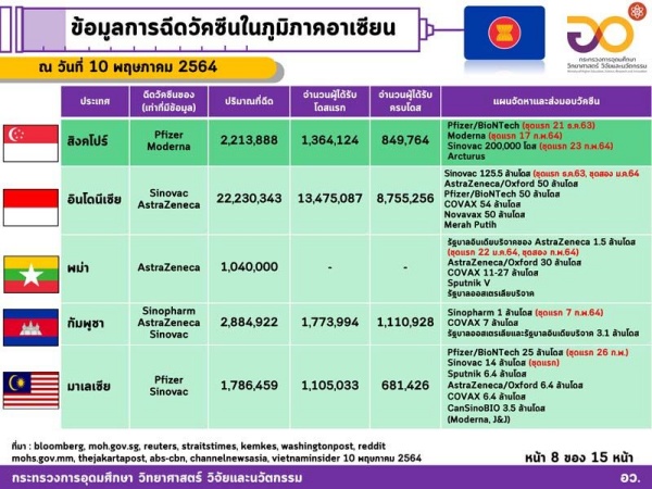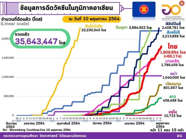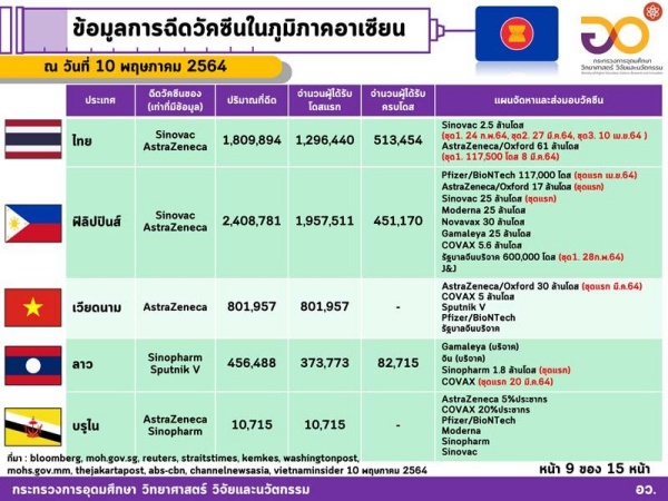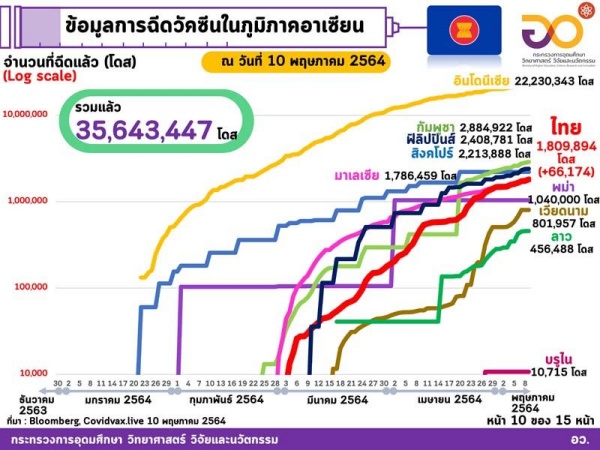 3. ในภูมิภาคอาเซียน ได้ฉีดวัคซีนแล้วครบ 10 ประเทศ รวมจำนวน 35,643,447 โดส ได้แก่