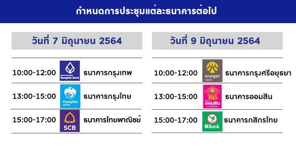 คู่ค้าทุกราย จะได้ทราบในข้อมูลมาตรการสินเชื่อฟื้นฟู และข้อเสนอแนะพิเศษต่างๆ จาก 6 ธนาคารพาณิชย์ชั้นนำของประเทศ อันจะเป็นประโยชน์ต่อคู่ค้าทุกรายในการพิจารณาทางเลือกที่ดีที่สุด ที่เหมาะสมที่สุด
