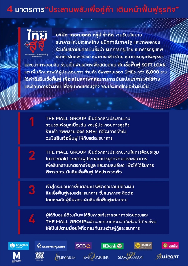 เดอะมอลล์ กรุ๊ป ขานรับนโยบายธนาคารแห่งประเทศไทย ผนึกกำลังภาครัฐและภาคเอกชน ร่วมกับสถาบันการเงินชั้นนำ ธนาคารกรุงไทย ธนาคารกรุงเทพ ธนาคารไทยพาณิชย์ ธนาคารกสิกรไทย ธนาคารกรุงศรีอยุธยา และธนาคารออมสิน ร่วมเป็นพันธมิตรเพื่อสนับสนุนสินเชื่อฟื้นฟู SOFT LOAN และเพิ่มศักยภาพ
