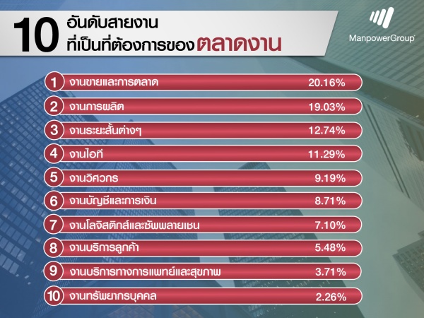นางสาวสุธิดา กาญจนกันติกุล ผู้จัดการฝ่ายการตลาด แมนพาวเวอร์กรุ๊ป ประเทศไทย เปิดเผยต่อว่า จากผลการสำรวจของแมนพาวเวอร์กรุ๊ป ประเทศไทย ประจำปี 2565 จากทิศทางและสถานการณ์ที่เกิดขึ้นแมนพาวเวอร์กรุ๊ป ประเทศไทย ได้ดำเนินการสำรวจและจัดอันดับตลาดแรงงาน 10 อันดับสายงานที่ตลาดงานต้องการ (ภาพในตาราง) ดังนี้ อันดับ 1 สายงานขายและการตลาด 20.16%, อันดับ 2 สายงานการผลิต 19.03%, อันดับ 3 งานระยะสั้นต่างๆ 12.74%, อันดับ 4 สายงานไอที 11.29%, อันดับ 5 สายงานวิศวกร 9.19%, อันดับ 6 สายงานบัญชีและการเงิน 8.71%, อันดับ 7 สายงานโลจิสติกส์และ ซัพพลายเชน 7.10%, อันดับ 8 สายงานบริการลูกค้า 5.48%, อันดับ 9 สายงานบริการทางการแพทย์และสุขภาพ 3.71% และอันดับ 10 สายงานทรัพยากรบุคคล 2.26% ตามลำดับ