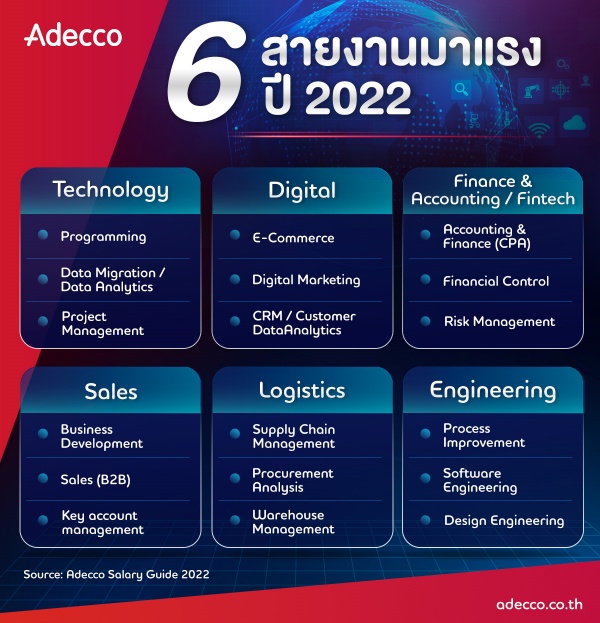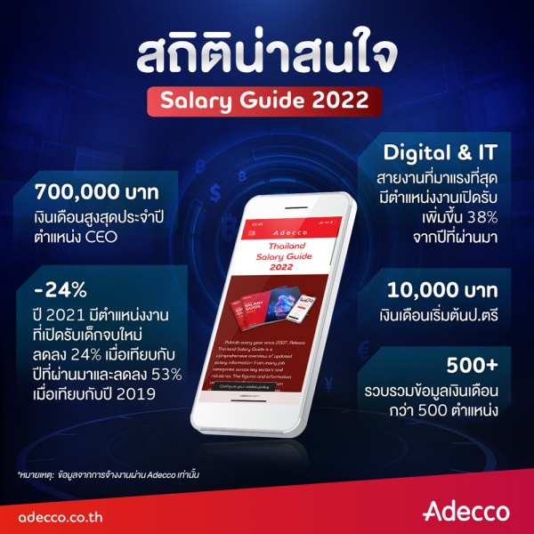 บริษัท อเด็คโก้ประเทศไทย Recruitment Agency ผู้นำด้านการให้บริการทรัพยากรบุคคลแบบครบวงจร เปิดตัว Salary Guide 2022 เผยข้อมูลอัตราเงินเดือนประจำปีที่ผ่านมาในสายอาชีพต่าง ๆ จากบริษัทชั้นนำที่เป็นลูกค้าของ Adecco กว่า 3,000 บริษัท