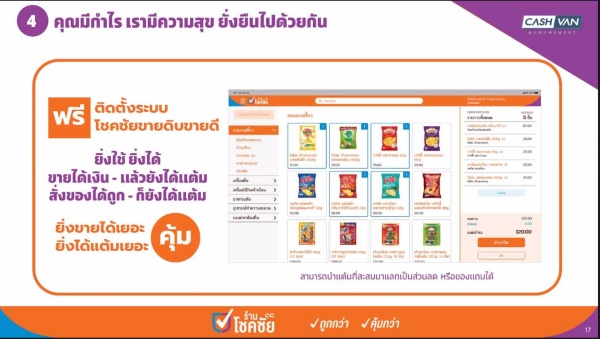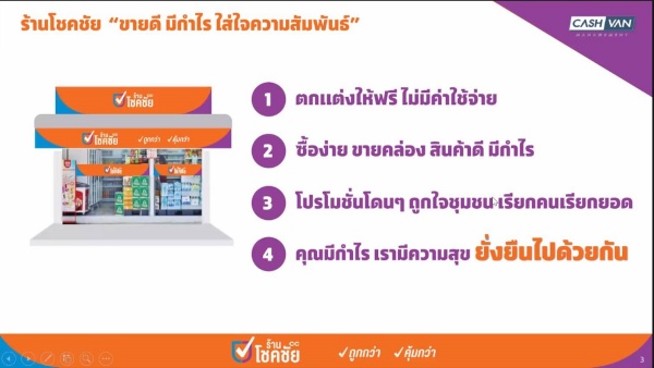 ทั้งนี้ หน่วยรถแคชแวนจะมีหน้าที่ทำการสำรวจ ประเมินร้านค้าที่มีคุณสสมบัติเข้าข่าย โดยร้านค้าที่ผ่านคุณสมบัติพร้อมร่วมพันธมิตรกับร้านโชคชัยที่มาพร้อมสโลแกน ‘ขายดี มีกำไร ใส่ใจความสัมพันธ์’ จะได้รับสิ่งต่างๆ ดังนี้