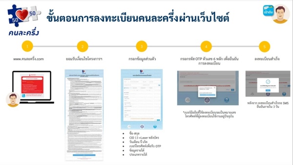 ลงทะเบียนผ่าน www.คนละครึ่ง.com : เริ่มจากคลิกเข้าเว็บไซต์นี้ จากนั้นกดยินยอม/ยอมรับเงื่อนไขโครงการ จากนั้นกรอกข้อมูลส่วนตัวให้ละเอียด ได้แก่ ชื่อ-สกุล, หมายเลขบัตรประชาชน 13 หลัก, เลขหลังบัตร, วันเดือน ปี เกิด, เบอร์โทรศัพท์เพื่อรับ OTP, ข้อมูลรายได้, ประเภทรายได้ จากนั้นกรอกรหัส OTP ตัวเลข 6 หลัก เพื่อยืนยันการลงทะเบียน รอสักครู่ ระบบจะโชว์ข้อความว่า “ลงทะเบียนสำเร็จ” จากนั้นรอ SMS ยืนยันภายใน 3 วัน
