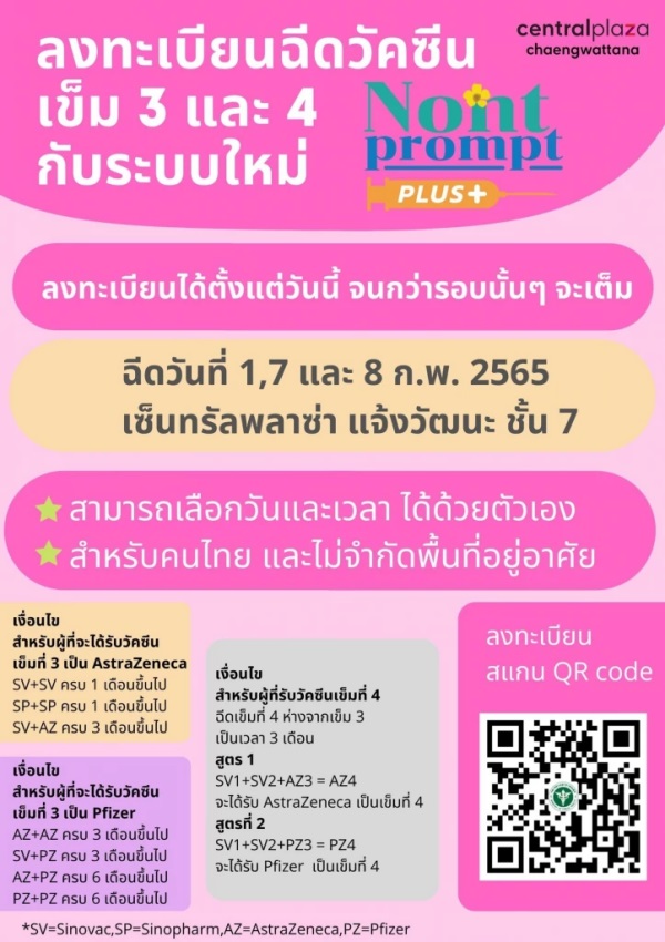 สำนักงานสาธารณสุขจังหวัดนนทบุรี เปิด “ลงทะเบียนฉีดวัคซีนเข็ม 3” และ เข็ม 4 booster shots กับระบบใหม่ นนท์พร้อม plus สำหรับคนไทยและไม่จำกัดพื้นที่อยู่อาศัย เปิดลงทะเบียนวันนี้ จนกว่ารอบนั้นๆจะเต็มและเข้ารับการ “ฉีดวัคซีนเข็ม 3” และเข็ม 4 ในวันที่ 1 7 และ 8 ก.พ.2565 เซ็นทรัลพลาซ่า แจ้งวัฒนะ ชั้น 7 ตั้งแต่เวลา 10.00-15.00 น. โดยสามารถเลือกวันและเวลาได้ด้วยตนเอง
