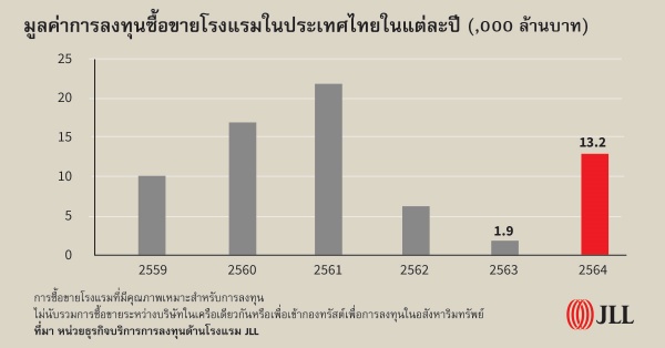 รายงานการศึกษาล่าสุดจากบริษัทที่ปรึกษาและบริการด้านอสังหาริมทรัพย์ เจแอลแอล เผยว่า ในปี 2564 ที่ผ่านมา มีการซื้อขายโรงแรมเกิดขึ้นในประเทศไทยรวม 23 โรง คิดเป็นจำนวนห้องพักรวมราว 3,000 ห้อง และมูลค่าการซื้อขายรวม 1.32 หมื่นล้าน เพิ่มขึ้นจากปี 2563 ถึง 550% และสูงกว่าค่าเฉลี่ยของมูลค่าการซื้อขายต่อปีในช่วง 10 ปีก่อนเกิดคิดระหว่างปี 2552-2562 อยู่ที่ราว 30%