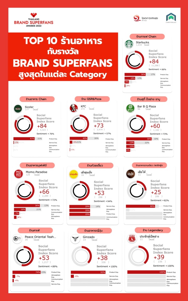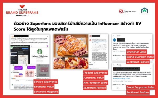นอกจากนี้ Baramizi ยังพบว่าแบรนด์ที่ได้คะแนนสูงสุดจาก 57 แบรนด์ ได้แก่ Starbucks ที่มีการพูดถึงในโซเชียลมีเดียมากถึง 1,034 ข้อความในช่วงเวลาดังกล่าว และเป็นข้อความเชิงบวก 66% คิดเป็นคะแนน Social Superfans Index ได้ถึง 11,288 คะแนน โดยเป็นการชื่นชมทั้งประสบการณ์ด้านสินค้า การบริการ บรรยากาศ และด้านการสื่อสาร เป็นแบรนด์ผู้นำที่มากด้วยจำนวน คุณภาพข้อความที่ถูกกล่าวถึง ตลอดจนอัตราการมีปฏิสัมพันธ์ในโซเชียลมีเดีย ในขณะที่แบรนด์ขนาดเล็กแต่เก๋าอย่างแบรนด์ร้านก๋วยเตี๋ยว เฮ้ง ชุน เส็ง มีจำนวนการกล่าวถึงไม่มาก แต่พบว่าเป็นการบอกต่อเชิงบวกถึง 94% และพบว่า เฮ้ง ชุน เส็ง เป็นแบรนด์ที่มีจำนวนการชื่นชมในทางบวกทั้งสินค้า บริการ และบรรยากาศร้าน นับเป็นหนึ่งในไม่กี่แบรนด์ที่ถูกพูดถึงด้านบริการในจำนวนที่มากกว่าสินค้า ซึ่งเป็นผลจากการดูแลลูกค้าตามสไตล์ของตนเองจนสร้างความประทับใจและทำให้ลูกค้าทนไม่ไหวต้องบอกต่อในโลกออนไลน์นั่นเอง