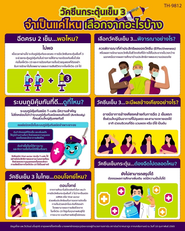 จากสถานการณ์โรคโควิด-19 ที่ยังคงแพร่ระบาดและกลายพันธุ์อย่างต่อเนื่อง กระทรวงสาธารณสุขได้มีนโยบายฉีดวัคซีนกระตุ้นเข็มที่ 3 ให้แก่ประชาชนไทยในสูตรต่างๆ โดยขณะที่มีการฉีดวัคซีนเข็มที่ 3 ให้แก่ประชาชนไปแล้วกว่า 21.1 ล้านโดส[1] พบว่าหลายคนยังสงสัยว่าวัคซีนกระตุ้นเข็มที่ 3 มีความจำเป็นเพียงใด และควรเลือกวัคซีนกระตุ้นเข็มที่ 3 อย่างไร