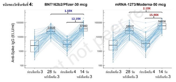 โดยหากเทียบกับระดับแอนติบอดี้ก่อนการได้รับวัคซีนเข็มที่ พบว่า วัคซีนไฟเซอร์ขนาด 30 ไมโครกรัม สามารถเพิ่มระดับแอนติบอดี้ได้ 12.19 เท่า ส่วนวัคซีนโมเดอร์น่าเข็มกระตุ้นขนาด 50 ไมโครกรัม เพิ่มระดับแอนติบอดี้ได้ 15.90 เท่า และหากทำการเปรียบเทียบกับระดับแอนติบอดี้ที่ระดับสูงสุดที่ตรวจวัดได้ภายหลังจากการฉีดวัคซีนเข็มที่ พบว่า วัคซีนไฟเซอร์ขนาด 30 ไมโครกรัม มีการเพิ่มขึ้นของแอนติบอดี้ 1.59 เท่า ส่วนวัคซีนโมเดอร์น่าเข็มกระตุ้นขนาด 50 ไมโครกรัม พบการเพิ่มสูงขึ้น 2.19 เท่า