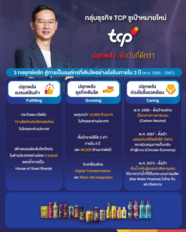 นายสราวุฒิ อยู่วิทยา ประธานเจ้าหน้าที่บริหาร กลุ่มธุรกิจ TCP เปิดเผยว่า “เมื่อ 5 ปีที่แล้ว เราประกาศรวมแบรนด์องค์กร “กลุ่มธุรกิจ TCP” และเดินหน้าสู่เป้าหมายการพัฒนาอย่างยั่งยืน ถึงปัจจุบันเหตุการณ์ต่างๆ เช่น โควิด-19 การเปลี่ยนแปลงทางดิจิทัล ที่ส่งผลกระทบต่อธุรกิจ สังคมและสิ่งแวดล้อมเป็นอย่างมาก เราจึงกลับมาคิดทบทวนเป้าหมาย และกลยุทธ์ในทุกๆ ส่วน เพื่อรับมือกับความเปลี่ยนแปลงต่างๆ ที่จะเกิดขึ้นในอนาคต รวมถึงสร้างการเติบโตให้กับองค์กรพร้อมกับปลุกพลังความยั่งยืนให้กับโลกใบนี้ ด้วยเป้าหมายใหม่ “ปลุกพลัง เพื่อวันที่ดีกว่า”