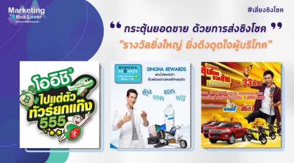 เสี่ยงที่จะลุ้น – ด้านลุ้นโชค ชิงโชค จากผลสำรวจพฤติกรรมคนไทย ส่วนใหญ่คาดหวังรางวัลใหญ่จากการส่งชิงโชคสูงถึง 75.3% แสดงให้เห็นว่า คนส่วนใหญ่ที่เล่นกิจกรรมชิงโชค ไม่ว่าจะเป็นการส่ง SMS ส่งรหัสใต้ฝาน้ำดื่ม หรือแม้กระทั่งการเขียนชื่อ-ที่อยู่หยอดลงตู้รับตามห้างสรรพสินค้าชั้นนำต่างๆ มีความคาดหวังอยากได้รางวัลใหญ่ทั้งนั้น ซึ่งของรางวัลส่วนใหญ่ที่ผู้บริโภคอยากได้รับ ส่วนมากจะเป็นของที่มีมูลค่า เช่น เงินสด ทองคำ หรือของรางวัลเฉพาะบางกลุ่ม เช่น สมาร์ทโฟน ตั๋วเครื่องบินพร้อมที่พัก ตั๋วคอนเสิร์ต เป็นต้น โดยการทำการตลาดชิงโชค โปรโมชั่นชิงโชค ยังเป็นเครื่องมือโปรโมทแบรนด์ที่มีประสิทธิภาพและกระตุ้นยอดขายมาตลอดปัจจุบัน ทำให้แบรนด์เป็นที่รู้จักการบอกต่อ การทำโฆษณา การสร้างแรงจูงใจให้ลูกค้าด้วยการแจกของรางวัล อีกทั้งยังทำให้ได้ลูกค้าใหม่ที่อาจจะมีการสลับแบรนด์ได้หันมาทดลองใช้สินค้าของเราได้ง่ายด้วยแคมเปญชิงโชค ยกตัวอย่าง ศึกแบรนด์ โออิชิ กิจกรรมไปแต่ตัวทัวร์ยกแก๊ง กับ อิชิตัน กิจกรรมเปิดฝา รหัสรวยเปรี้ยง เป็นต้น