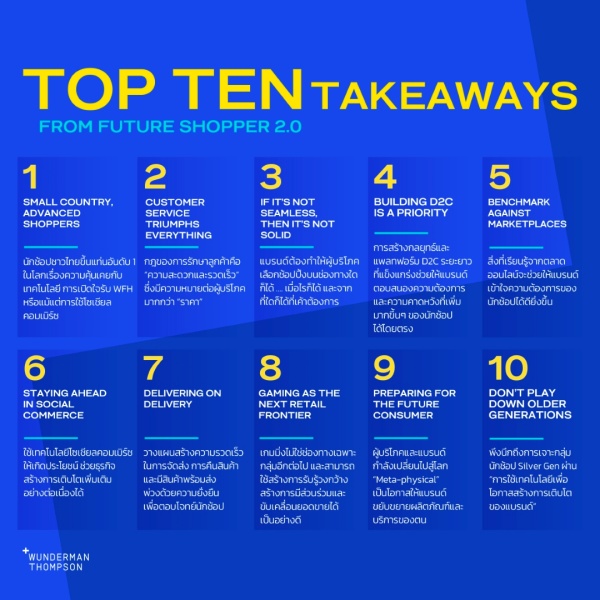 “วันเดอร์แมน ธอมสัน” เผย ผู้บริโภคชาวไทยขึ้นแท่นนักช้อปที่ใจเร็วและพิสมัยความไวที่สุดในโลก ทั้งยังติดอันดับต้นๆ ในการช้อปบนโซเชียลคอมเมิร์ซและการเปิดใจรับเทคโนโลยีใหม่ ซึ่งร่องรอยเหล่านี้ล้วนแล้วแต่มีนัยยะสำคัญที่บ่งชี้ว่าผู้บริโภคชาวไทยจะให้ความสำคัญต่อประสบการณ์ลูกค้ามากกว่าเรื่องของแบรนด์และราคา