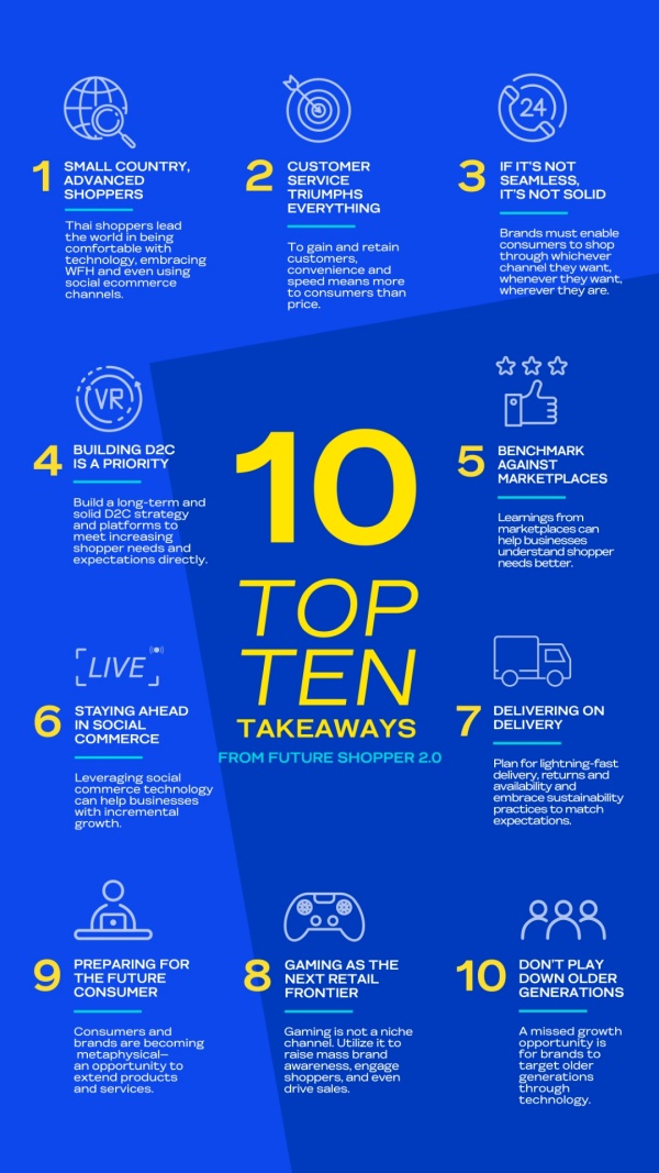 “การศึกษาครั้งล่าสุดของเราเผยให้เห็นถึงทัศนคติและพฤติกรรมดิจิทัลของผู้บริโภคชาวไทย ความเปลี่ยนแปลงที่เกิดขึ้นกับเส้นทางลูกค้า ผลกระทบของแพลตฟอร์มอี-คอมเมิร์ซต่างๆ ประสบการณ์ช้อปปิ้งออนไลน์ที่พวกเขาชื่นชอบและความคาดหวัง ตลอดจนโลกของการช้อปปิ้งที่เราจะได้พบในอนาคต การปรับตัวให้สอดคล้องและนำข้อค้นพบเหล่านี้ไปใช้จะช่วยสร้าง เค้าโครงที่เป็นส่วนสำคัญในการวางแผนธุรกิจและกลยุทธ์ออนไลน์ของคุณได้ตั้งแต่วันนี้ เพื่อวันข้างหน้า” มัวรีน กล่าวสรุป