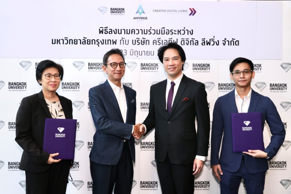มหาวิทยาลัยกรุงเทพ โดย ผู้ช่วยศาสตราจารย์ สรรเสริญ มิลินทสูต รองอธิการบดีอาวุโส ด้านวิชาการ มหาวิทยาลัยกรุงเทพ และ คุณพิชเยนทร์ หงษ์ภักดี ประธานกรรมการบริหาร บริษัท ครีเอทีฟ ดิจิทัล ลิฟวิ่ง จำกัด ร่วมด้วย ผู้ช่วยศาสตราจารย์ ดร.อรรยา สิงห์สงบ รองอธิการบดี สายวิชาการ มหาวิทยาลัยกรุงเทพ และ คุณอัมพรสักก์ อังคทะวานิช ประธานเจ้าหน้าที่บริหาร บริษัท ครีเอทีฟ ดิจิทัล ลิฟวิ่ง จำกัด ลงนามบันทึกข้อตกลงความร่วมมือทางวิชาการและกิจกรรมเพื่อพัฒนาระบบการเรียนรู้บนโลกเสมือน (Aniverse Metaverse) ในการร่วมกันดำเนินกิจกรรมทางวิชาการทำให้เกิดการเรียนการสอนบนโลกเสมือน ที่สามารถแบ่งปันองค์ความรู้ ผู้สอน นักศึกษา และผู้พัฒนาระบบ โดยวัตถุประสงค์ของหน่วยงานทั้งสอง ได้แก่