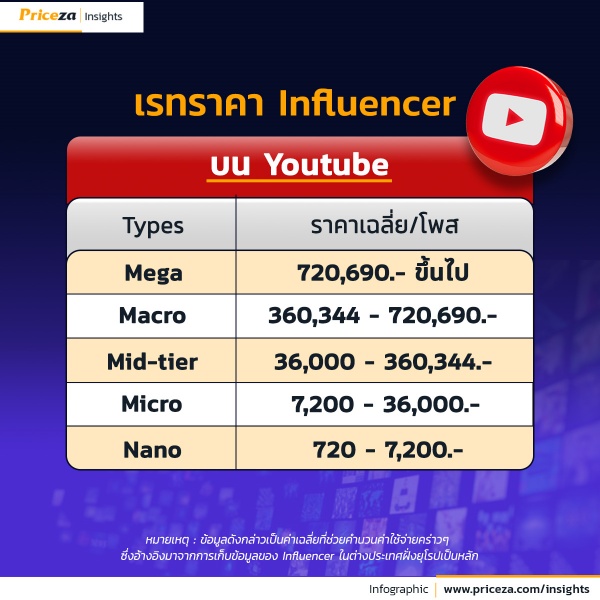 ครั้งนี้เราจึงนำเรทราคาสำหรับการว่าจ้าง Influencer มาเปิดเผยให้นักการตลาดได้ศึกษากัน โดยข้อมูลต่อไปนี้เป็นค่าเฉลี่ยที่ช่วยคำนวนค่าใช้จ่ายคร่าวๆ ที่อ้างอิงมาจากการเก็บข้อมูลของ Influencer ในต่างประเทศฝั่งยุโรปเป็นหลัก ซึ่งในประเทศไทยอาจมีการคลาดเคลื่อนเล็กน้อย ตามค่าเงินและสถานการณ์ทางเศรษฐกิจ โดยเรทราคา Influencer จะแบ่งไปตามแต่ละแพลตฟอร์ม และระดับของอินฟลูเอนเซอร์ดังนี้