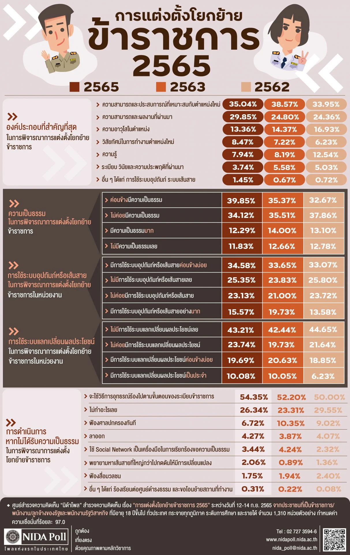 ศูนย์สำรวจความคิดเห็น “นิด้าโพล” สถาบันบัณฑิตพัฒนบริหารศาสตร์ (นิด้า) เปิดเผยผลสำรวจของประชาชน เรื่อง “การแต่งตั้งโยกย้ายข้าราชการ 2565” ทำการสำรวจระหว่างวันที่ 12-14 กันยายน 2565 จากประชาชนที่เป็นข้าราชการ พนักงาน ลูกจ้างของรัฐ และพนักงานรัฐวิสาหกิจ อายุ 18 ปีขึ้นไป กระจายทุกภูมิภาค ระดับการศึกษา และรายได้ ทั่วประเทศ รวมทั้งสิ้น จำนวน 1,310 หน่วยตัวอย่าง เกี่ยวกับการแต่งตั้งโยกย้ายข้าราชการ และความเป็นธรรมในการแต่งตั้งโยกย้ายข้าราชการ การสำรวจอาศัยการสุ่มตัวอย่างโดยใช้ความน่าจะเป็นจากบัญชีรายชื่อฐานข้อมูลตัวอย่างหลัก (Master Sample) ของ “นิด้าโพล” สุ่มตัวอย่างด้วยวิธีแบบง่าย (Simple Random Sampling) เก็บข้อมูลด้วยวิธีการสัมภาษณ์ทางโทรศัพท์ โดยกำหนดค่าความเชื่อมั่น ร้อยละ 97.0
