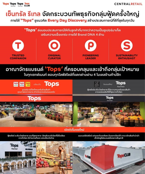 เซ็นทรัล รีเทล เดินหน้าจัดกระบวนทัพธุรกิจกลุ่มฟู้ดครั้งสำคัญในรอบ 26 ปี ด้วยกลยุทธ์ One Brand รวมทุกโมเดลค้าปลีกให้เป็นหนึ่งเดียว ตอกย้ำเบอร์ 1 ฟู้ดรีเทลเมืองไทย ภายใต้แบรนด์ “Tops” กับภาพลักษณ์ใหม่เป็นแบรนด์ที่ทันสมัย ด้วยแนวคิด “Every Day Discovery” ที่ไม่ได้เป็นเพียงซูเปอร์มาร์เก็ต แต่เป็นศูนย์รวมสำหรับการใช้ชีวิต ตอบรับทุกไลฟ์สไตล์ที่เปลี่ยนแปลงไปในทุกช่วงเวลาสร้างประสบการณ์และมอบแรงบันดาลใจใหม่ ๆ ให้กับลูกค้าทุกคน มีสินค้าที่ครบครัน และคงความเป็นผู้นำในการคัดสรรสินค้าคุณภาพจากแหล่งผลิตที่ดีที่สุดในทุกช่วงฤดูกาล ทั้งในประเทศและต่างประเทศ พร้อมเดินหน้าสู่การเป็น New Retail ยกระดับประสบการณ์ช้อปปิ้งไร้รอยต่ออย่างสมบูรณ์แบบที่สุด