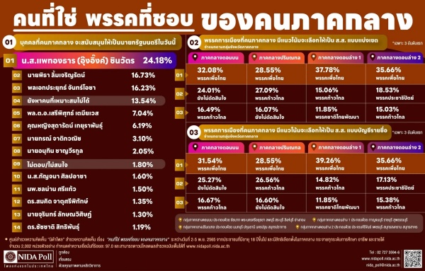 ศูนย์สำรวจความคิดเห็น “นิด้าโพล” สถาบันบัณฑิตพัฒนบริหารศาสตร์ (นิด้า) เปิดเผยผลสำรวจของประชาชน เรื่อง “คนที่ใช่ พรรคที่ชอบ ของคนภาคกลาง” ทำการสำรวจระหว่างวันที่ 2-5 พฤศจิกายน 2565 จากประชาชนที่มีอายุ 18 ปีขึ้นไป และมีสิทธิเลือกตั้งในภาคกลาง (จังหวัดในภาคกลาง ประกอบด้วย ชัยนาท พระนครศรีอยุธยา ลพบุรี สระบุรี สิงห์บุรี อ่างทอง นนทบุรี ปทุมธานี นครปฐม สมุทรปราการ กาญจนบุรี ราชบุรี สุพรรณบุรี ประจวบคีรีขันธ์ เพชรบุรี สมุทรสงคราม และสมุทรสาคร) กระจายทุกระดับการศึกษา อาชีพ และรายได้ รวมทั้งสิ้น จำนวน 2,002 หน่วยตัวอย่าง เกี่ยวกับคนที่ใช่ พรรคที่ชอบ ของคนภาคกลาง การสำรวจอาศัยการสุ่มตัวอย่างโดยใช้ความน่าจะเป็นจากบัญชีรายชื่อฐานข้อมูลตัวอย่างหลัก (Master Sample) ของ “นิด้าโพล” สุ่มตัวอย่างด้วยวิธีแบบง่าย (Simple Random Sampling) เก็บข้อมูลด้วยวิธีการสัมภาษณ์ทางโทรศัพท์ โดยกำหนดค่าความเชื่อมั่น ร้อยละ 97.0