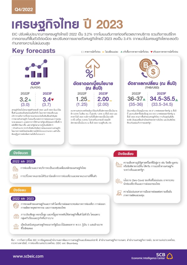 EIC ปรับประมาณการเศรษฐกิจไทยปี 2565 เป็น 3.2% (เดิม 3.0%) จากแรงส่งการท่องเที่ยวที่ฟื้นตัวต่อเนื่อง รวมถึงการบริโภคภาคเอกชนที่ได้รับอานิสงส์จากภาคการท่องเที่ยวและบริการที่เกี่ยวข้อง รวมถึงรายได้แรงงานที่ปรับดีขึ้น สำหรับปี 2566 EIC ปรับลดคาดการณ์การเติบโตของเศรษฐกิจไทยเป็น 3.4% (เดิม 3.7%) ตามแนวโน้มเศรษฐกิจโลกที่ชะลอลงมากภายใต้ความไม่แน่นอนที่สูงขึ้น บางประเทศหลักจะเข้าสู่ภาวะเศรษฐกิจถดถอย ส่งผลให้การส่งออกและการลงทุนของไทยชะลอลงตาม อย่างไรดี เศรษฐกิจไทยปีหน้าจะยังมีแรงส่งจากการท่องเที่ยวที่ฟื้นตัวได้ดีจากจำนวนนักท่องเที่ยวต่างชาติที่เร่งขึ้น