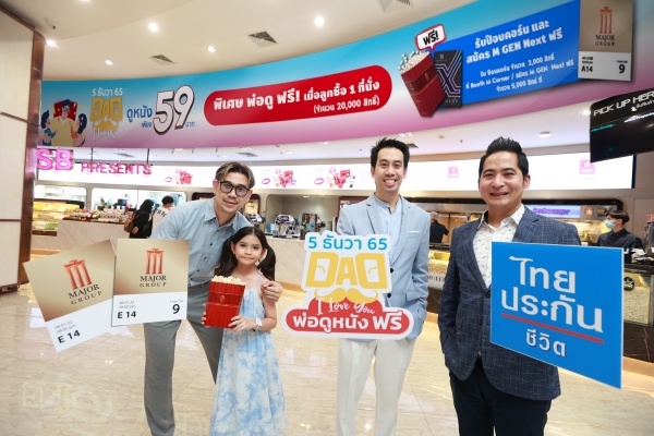 นรุตม์ เจียรสนอง รองประธานเจ้าหน้าที่บริหารฝ่ายการตลาด บริษัท เมเจอร์ ซีนีเพล็กซ์ กรุ้ป จำกัด (มหาชน) จับมือ นิติพงษ์ ปรัชญานิมิต ผู้ช่วยผู้จัดการใหญ่และ Chief Marketing Officer บริษัท ไทยประกันชีวิต จำกัด (มหาชน) จัดกิจกรรมในวันดี ๆ วันพ่อแห่งชาติ 5 ธันวาคม 2565 ให้คนไทยได้บอกรักพ่อกับแคมเปญ “ DAD…I LOVE YOU พ่อดูหนังฟรี” ชวนลูกบอกรักคุณพ่อให้ชื่นหัวใจ แล้วพาคุณพ่อไปดูหนังเรื่องโปรดด้วยกัน คุณพ่อดูฟรี 1 ที่นั่ง เมื่อลูกซื้อตั๋วหนัง 1 ที่นั่ง ในราคาเพียง 59 บาท จำนวน 20,000 สิทธิ์ พร้อมอร่อยกับป๊อปคอร์น ขนาด 46 ออนซ์ ฟรี 1 กล่อง จำนวน 2,000 สิทธิ์ เพียงคุณพ่อแสดงตั๋วหนังรับสิทธิ์ ที่ บูธ M Gen ทุกสาขาทั่วประเทศ (ยกเว้นสาขาไอคอน ซีเนคอนิค) สำหรับคุณพ่อที่อายุ 60 ปีขึ้นไป ยังรับสิทธิ์สมัครบัตร M GEN Next ฟรี จำนวน 5,000 สิทธิ์ อีกด้วย รับสิทธิ์ที่ Movie Club @Line Major Group