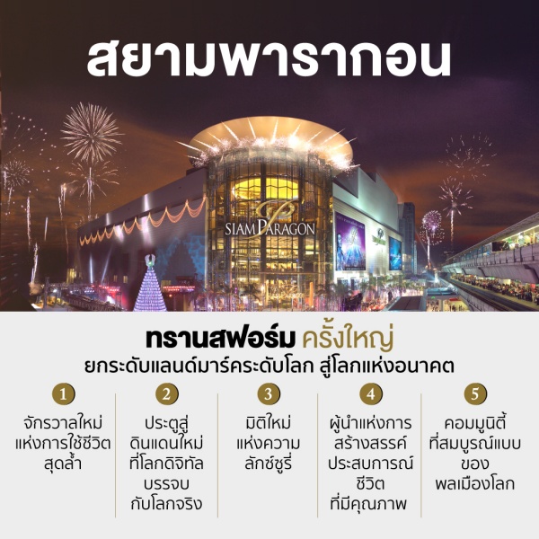 การยกระดับอีกมิติของการนำเสนอประสบการณ์เหนือความคาดหมายทั้งในศูนย์การค้าและในโลกดิจิทัล จะเพิ่มศักยภาพให้สยามพารากอนขยายฐานลูกค้าสู่ Global Citizen ให้แข็งแกร่งยิ่งขึ้นและเป็นการเติบโตด้วยความมั่นคง อย่างยั่งยืน โดยการสร้างพื้นที่ใหม่ๆเป็น cluster ที่มีสินค้า บริการ และกิจกรรมที่ตรงใจของคอมมูนิตี้ต่างๆ โดยให้ลูกค้ามีส่วนร่วมในการสร้างคอมมิวนิตี้นั้นๆ ให้สามารถแบ่งปันความคิด ความสนใจ หรือทำกิจกรรมและสร้างงานร่วมกันค้นพบเทคโนโลยีใหม่ๆ เพื่อสร้างธุรกิจร่วมกันได้จากทุกที่บนโลกใบนี้ไม่ว่าจะอยู่ที่ไหนก็ตาม