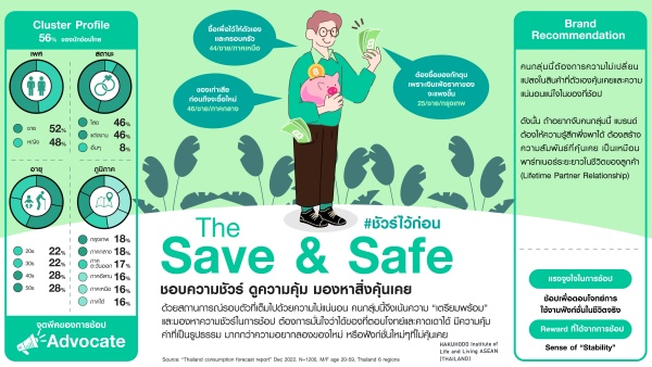 - The Save&Safe ไม่ว่าจะมีสถานการณ์โรคระบาด สงคราม เศรษฐกิจ หรือไม่ คนกลุ่มนี้ จะมีการ “เตรียมพร้อม” รับความไม่แน่นอนอยู่เสมอ และถือว่าเป็นกลุ่มที่เยอะที่สุดถึง 56% ของนักช้อปไทยในผลสำรวจ ดังนั้น ถ้าแบรนด์อยากจับคนกลุ่มนี้ แบรนด์ต้องให้ความรู้สึกพึ่งพาได้ ต้องสร้างความสัมพันธ์ที่คุ้นเคย ให้คนกลุ่มนี้เกิดความรู้สึกมั่นคงในการซื้อ