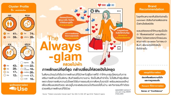 6.The Always-Glam เป็นอีกกลุ่ม 5% ของผลสำรวจ จากงานวิจัยพบว่า เสื้อผ้าและผลิตภัณฑ์เพื่อความงามมักติด Top 5 สินค้าที่ต้องการซื้อ และคนมีความต้องการซื้อสูงกว่า 30% ตลอดทั้งปี ทำให้เห็นว่า มีกลุ่มที่ชอบ