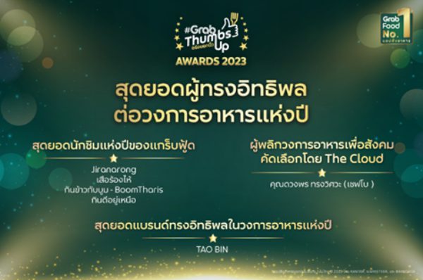 แกร็บฟู้ด แอปพลิเคชันสั่งอาหารอันดับ 1* ในประเทศไทย เผยรายชื่อ 40 สุดยอดร้านอาหารเดลิเวอรีประจำปีในงานประกาศรางวัล #GrabThumbsUp Awards 2023 ภายใต้ธีม “Grab Grows Greater” ที่จัดขึ้นเพื่อยกย่องและการันตีร้านอร่อยยกนิ้วที่คัดสรรโดยผู้ใช้บริการจากทั่วประเทศและผู้ทรงคุณวุฒิด้านอาหารและไลฟ์สไตล์จากหลายสาขา
