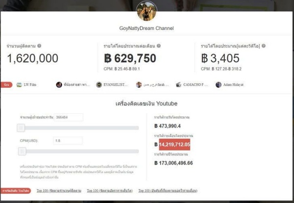 เว็บไซต์ NoxInfluencer ซึ่งเป็นระบบการให้บริการข้อมูลและวิเคราะห์เชิงลึกของ Influencer ได้รวบรวมฐานและจัดอันดับคนดังในสื่อออนไลน์ ไม่ว่าจะเป็น Youtube, Instagram, TikTok และ Twitch พบว่าเมื่อนำลิงก์ช่องของ ก้อย นัตตี้ ดรีม มาตรวจสอบพบว่า ช่องของเขามีจำนวนผู้ติดตาม 1,620,000 คน มีรายได้โดยรวมต่อเดือนราว 629,750 บาท (CPM : 25.46-89.1 บาท) ขณะที่รายได้โดยประมาณของแต่ละวิดีโออยู่ที่ 3,405 บาท (CPM: 127.28-฿ 318.2 บาท)