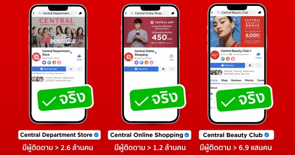 ทั้งนี้ สำหรับห้างเซ็นทรัลสาขาต่างจังหวัดที่มีเพจเฟซบุ๊กของสาขาเอง และไม่มีเครื่องหมายถูกสีฟ้า (Verified Badge) กำกับ ลูกค้าสามารถสังเกตว่าเป็นเพจจริงหรือเพจปลอมได้จากจำนวนผู้ติดตาม (Followers) ซึ่งจะต้องมีจำนวนมากกว่า 10,000 คนขึ้นไป ซึ่งหากมีจำนวนน้อยกว่า 10,000 คนจะเป็นเพจปลอม