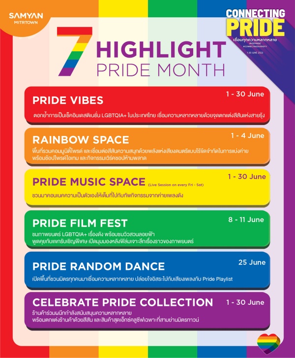 เตรียมมาเชื่อมต่อทุกความหลากหลายในย่านพระรามสี่กับกิจกรรมมากมายที่เต็มไปด้วยสีสัน และความสนุกสนานตลอดเทศกาล Pride month พร้อมเฉลิมฉลองไปกับความรักที่ไร้ขีดจำกัด ได้ที่