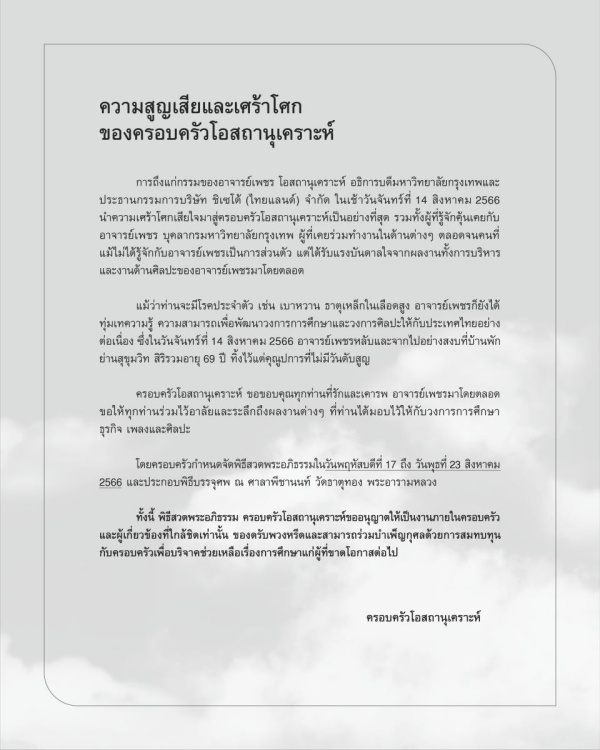 ครอบครัวโอสถานุเคราะห์ ขอขอบคุณทุกท่านที่รักและเคารพ อาจารย์เพชรมาโดยตลอด ขอให้ทุกท่านร่วมไว้อาลัยและระลึกถึงผลงานต่างๆ ที่ท่านได้มอบไว้ให้กับวงการการศึกษา ธุรกิจ เพลงและศิลปะ โดยครอบครัวกำหนดจัดพิธีสวดพระอภิธรรมในวันพฤหัสบดีที่ 17 ถึง วันพุธที่ 23 สิงหาคม 2566 และประกอบพิธีบรรจุศพ ณ ตาลาพีชานนท์ วัดธาตุทอง พระอารามหลวง