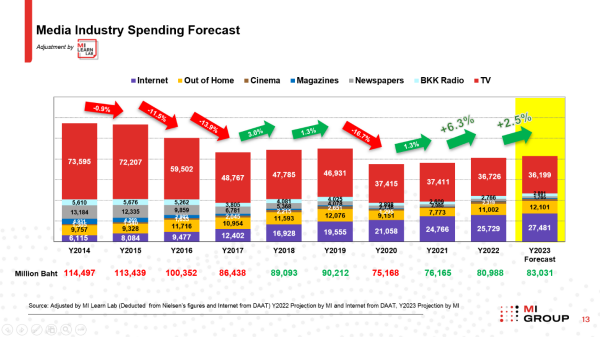 MI GROUP มองภาพรวมเม็ดเงินสื่อโฆษณาปีนี้ คงไปในทิศทางที่เคยคาดการณ์ไว้ก่อนหน้านี้ ซึ่งเม็ดเงินสื่อโทรทัศน์จะลดลงอย่างต่อเนื่อง โดยปีนี้น่าจะลดลงเล็กน้อย -1% เมื่อเปรียบเทียบกับปีที่ผ่านมา ส่วนสื่อดิจิทัลและสื่อนอกบ้าน (Out of Home & Transit) ยังคงเติบโตต่อเนื่อง ซึ่งคาดว่าปีนี้จะมีอัตราการเติบโตอย่างน้อย +7% และ +10% ตามลำดับ (ตัวเลขคาดการณ์ของ Digital Ad Spending ในปีนี้ ทาง DAAT จะแถลงโดยละเอียดในวันที่ 31 สิงหาคม ที่งาน DAAT Day 2023)